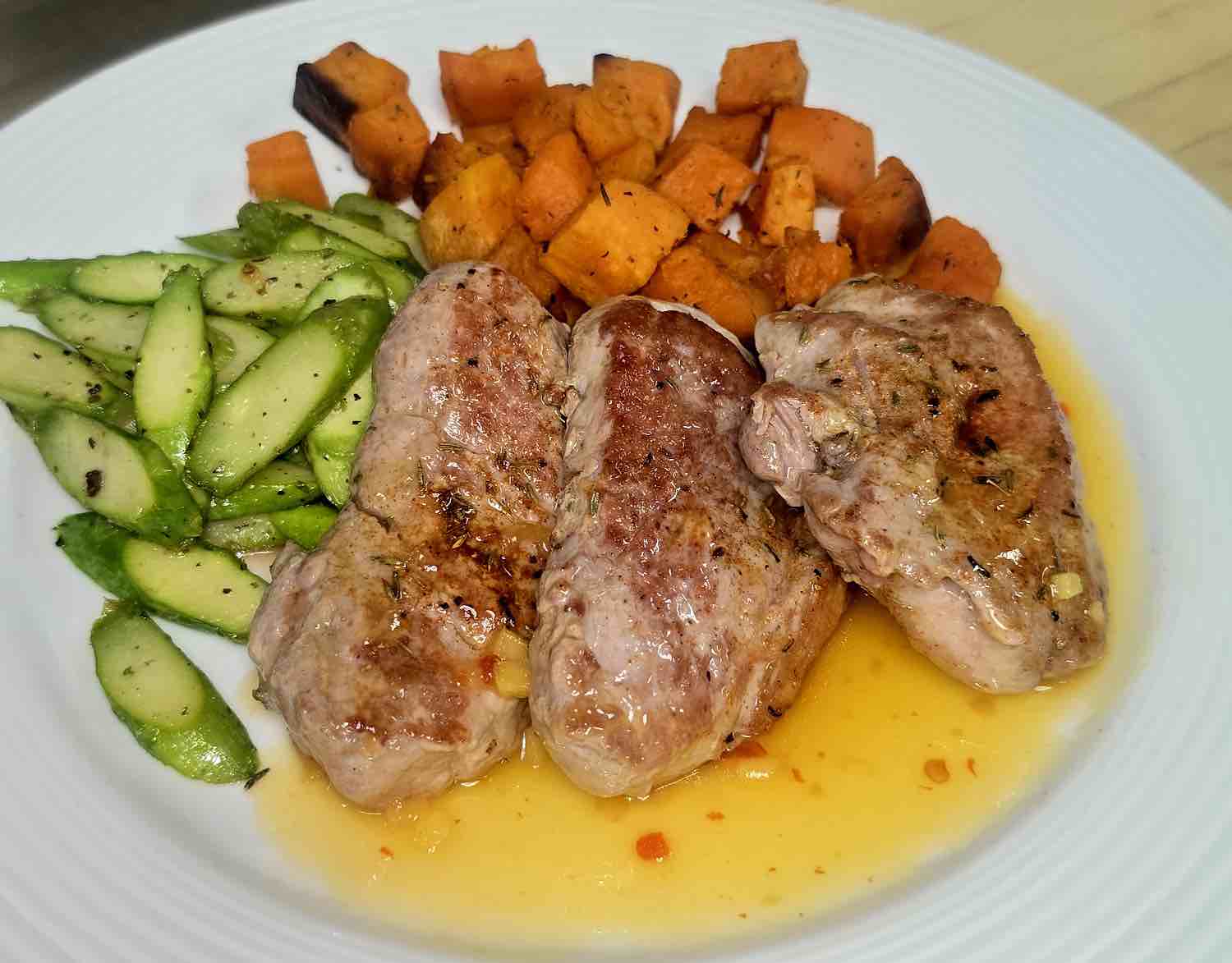 Pan seared pork medallions with an orange ginger glaze roasted sweet potato and sautéed asparagus